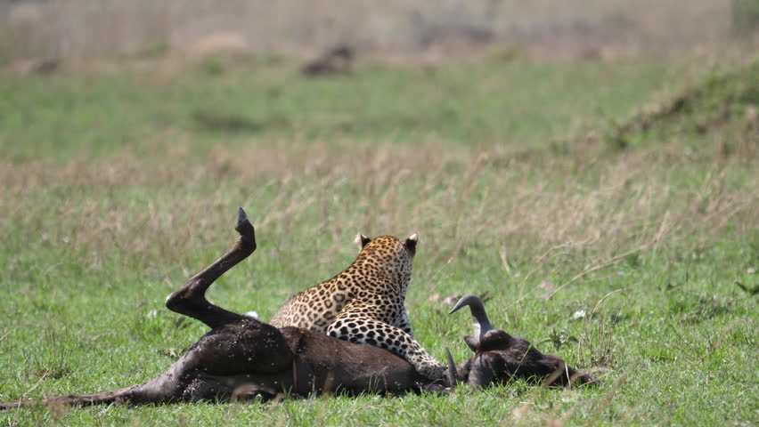 Leopard gives his best to carry the killed Wildebeest away