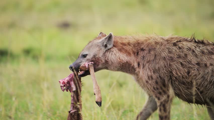 Slow Motion of Hyena Scavenging in Africa, Eating a Leg Bone of a Dead Animal Kill Showing Scavenger Animal Behavior, Amazing Animal Behaviour in African Masai Mara in Kenya