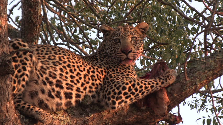 Beautiful leopard in a tree staring at camera with a kill under the golden orange glow of the African sun