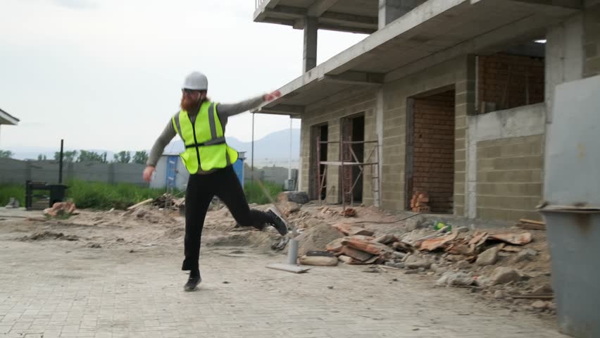 Bearded builder engineer dancing at construction site jumping kicking legs in air celebrating receiving salary going on vacation