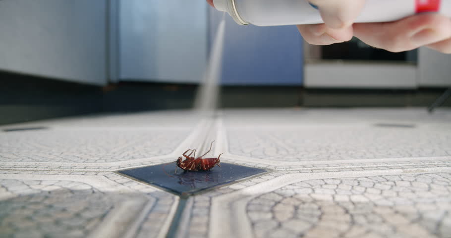 Сockroach is sprayed with a spray can with insecticide struggling