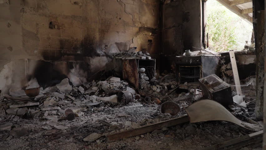 Slow motion of interior of destroyed home in Kibbutz Nir Oz, burned kitchen and total horror after October 7th attack