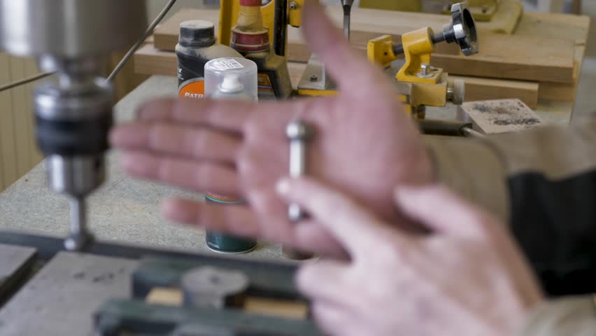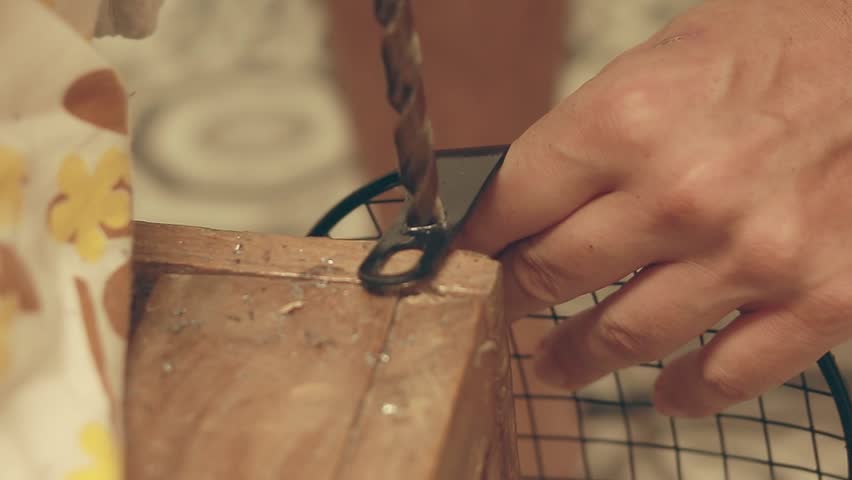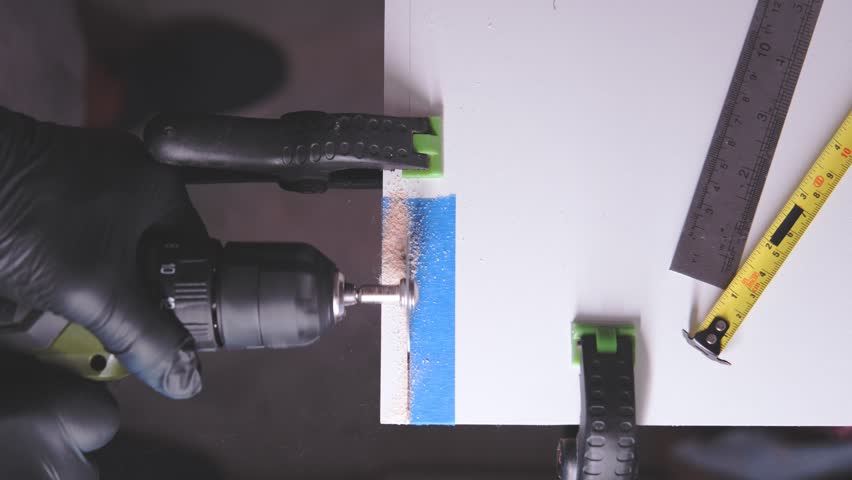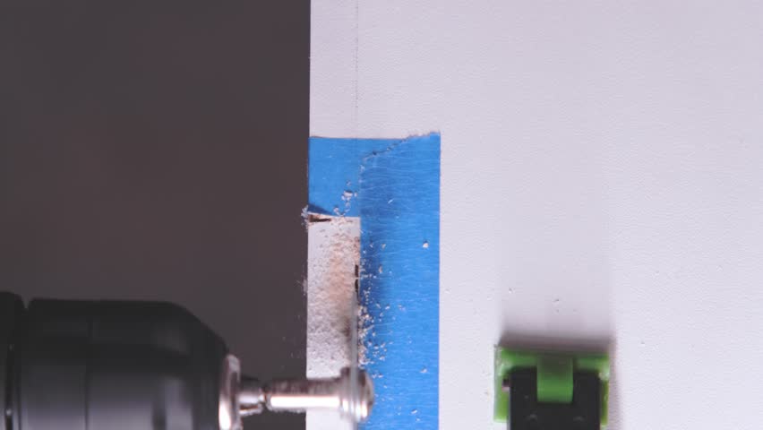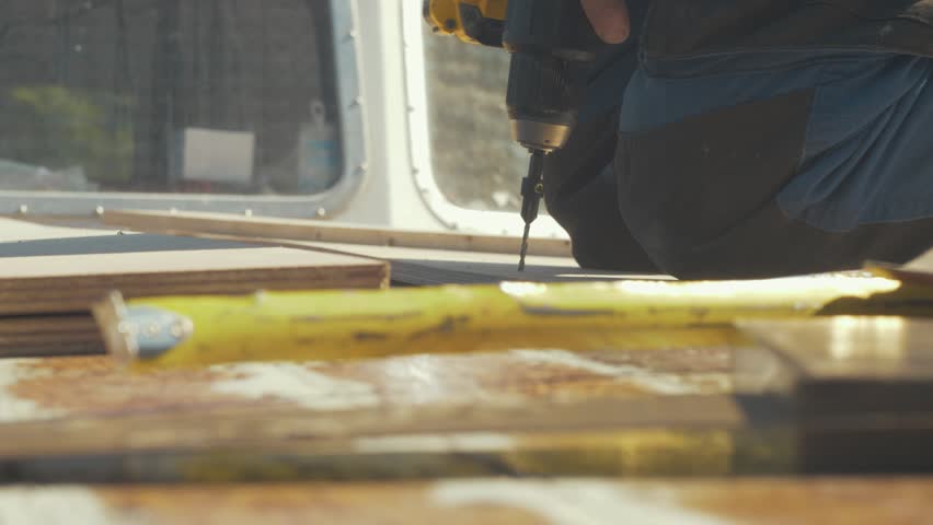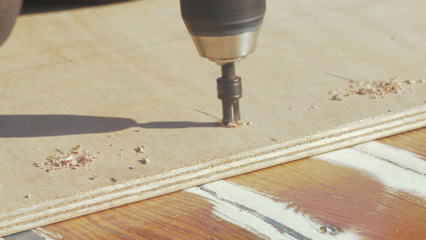 Low Angle, Close Up of a Drill Drilling a Hole into a Floor Board, Home DIY Repair and Renovation