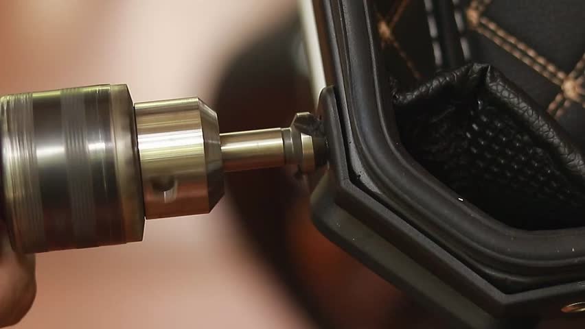 Close up to a countersink drill bit used in drilling a hole in a hard plastic case