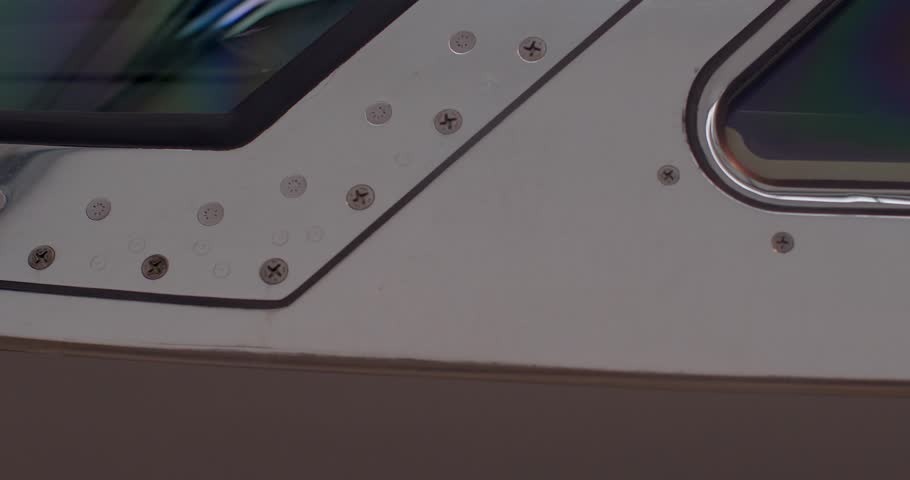 Riveted window frame closeup detail showing polished metal trim, rivets and tinted glass in hangar during quality control inspection