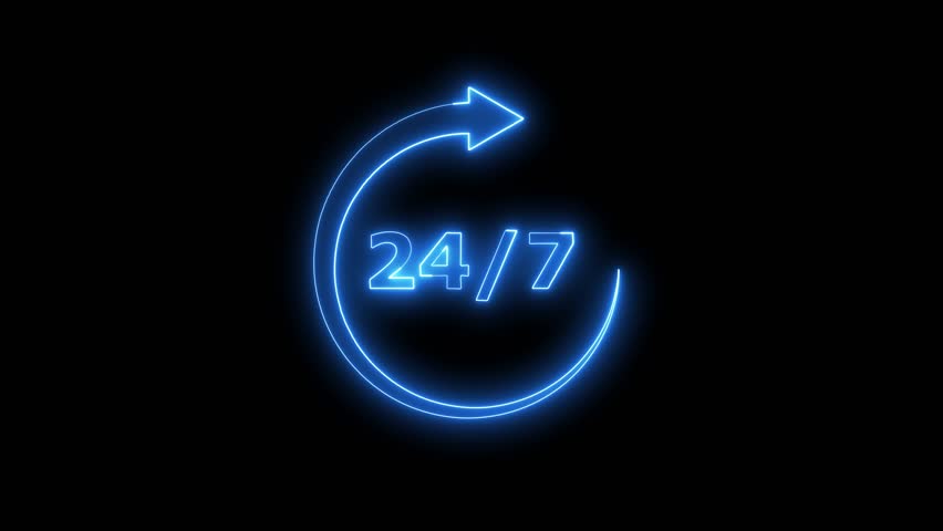 Animated support around neon light clock, round clock working 24 hours 7 days, arrow turning around