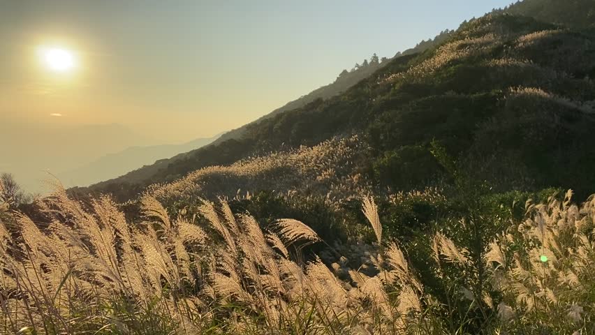 Golden sunset over Yangmingshan's fields of silvergrass swaying gently in the breeze