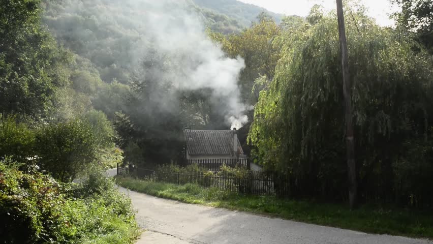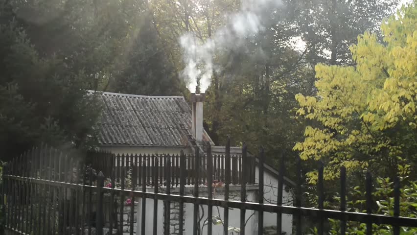 House in forest emitting smoke from a burning chimney, creating a warm and tranquil winter atmosphere