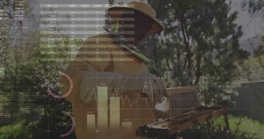 Senior beekeeper inspecting hive frame in apiary, displaying tech data pie charts bar graphs map