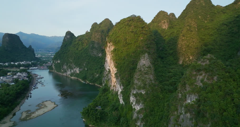 Aerial view close to a mountain wall, toward Xingping town, sunset in China