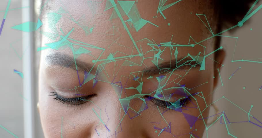 materializing green purple AR overlay guiding female model opening eyes smiling in technology demo