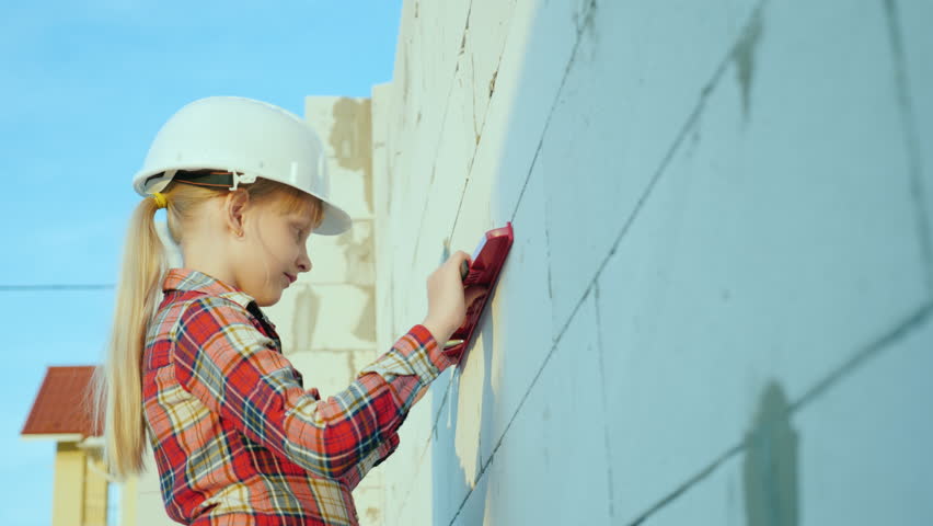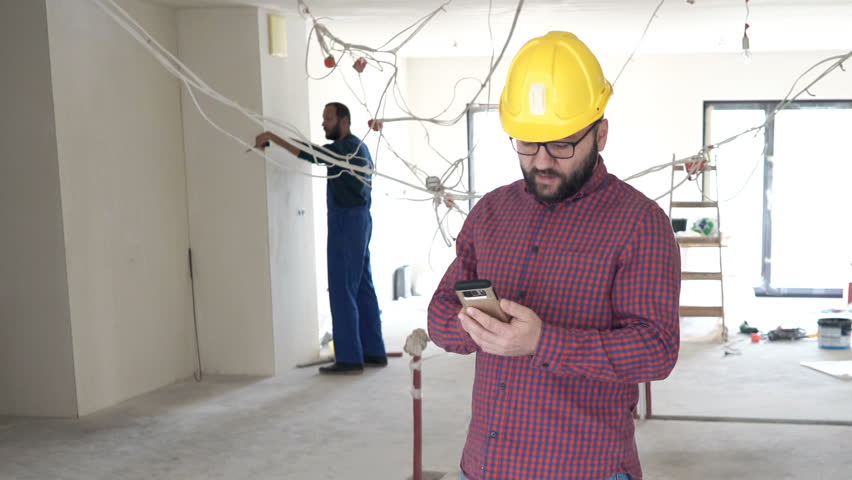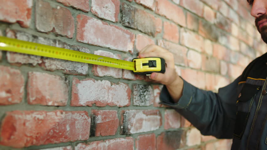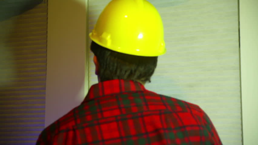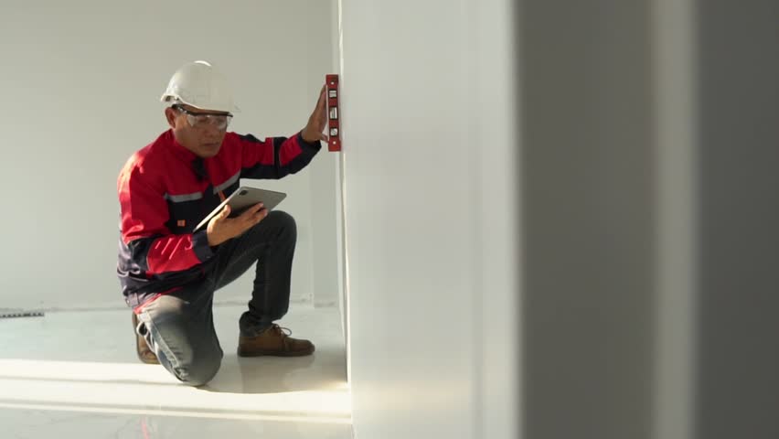 Closeup to the camera builder man make some measurements of walls to check if they are right and straight he wearing safety helmet and equipment