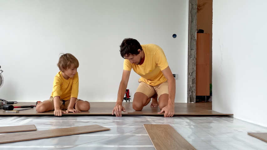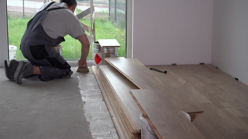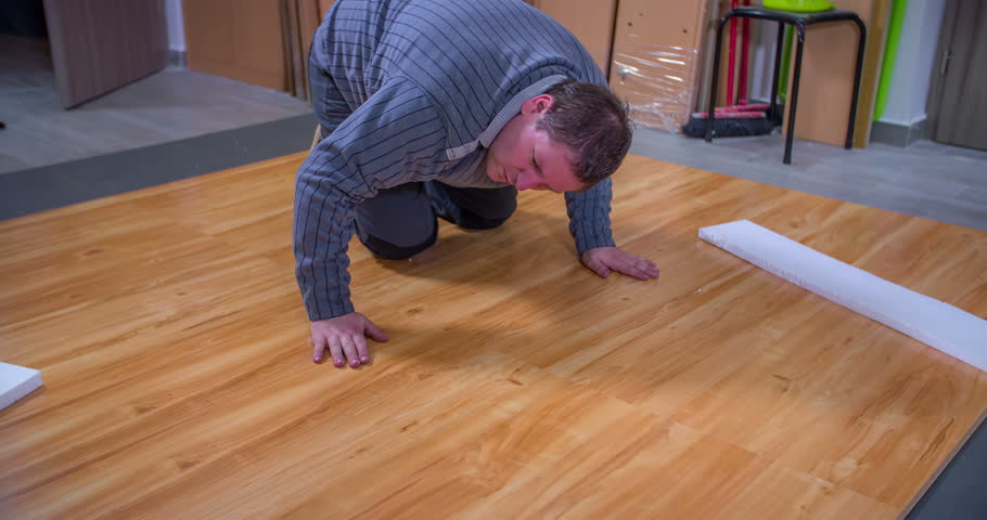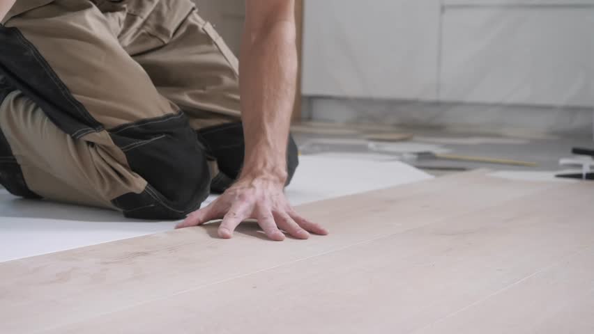 skilled repairman in coloured jumpsuit checks brown wooden laminate on floor against tile close view