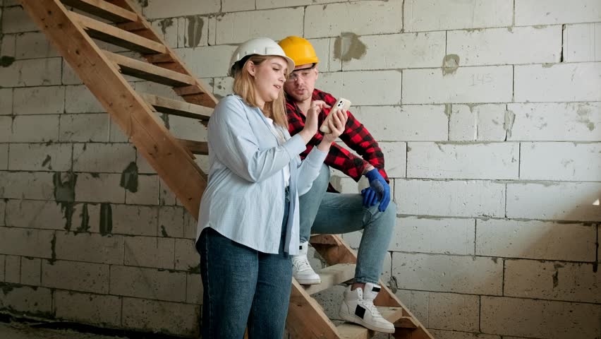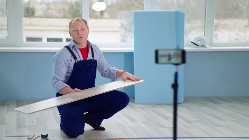Vlogging while laying the laminate, professional man in work suit hold board and making a record on a gadget during the repair in a new house or apartment