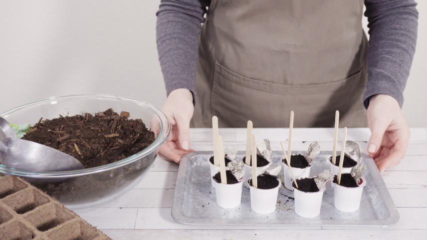 Little girl helping to plant herb seeds into small containers for a homeschool project