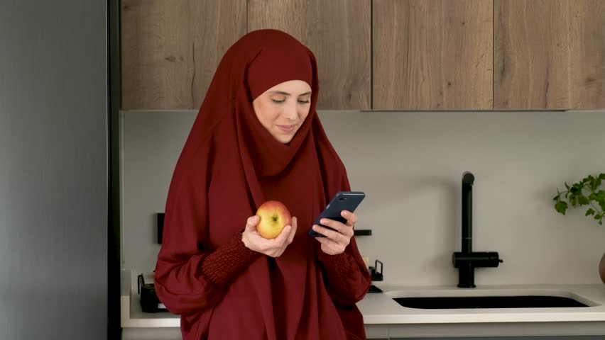 Muslim young woman in hijab drinking coffee and using smartphone in the kitchen at home