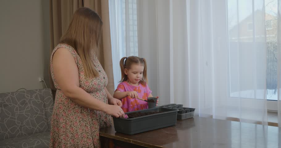 Cute little girl with pigtails carefully helping her mother fill small pots with potting soil, preparing to sow seeds together for spring planting in their cozy home by the window