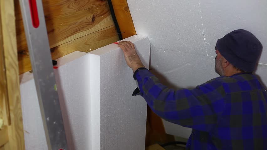 A repairman measuring the Styrofoam for fitting it into the wooden wall for insulation