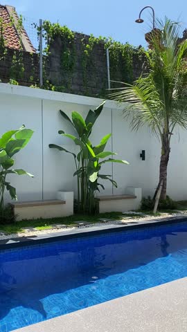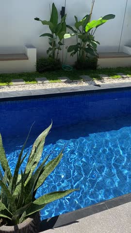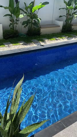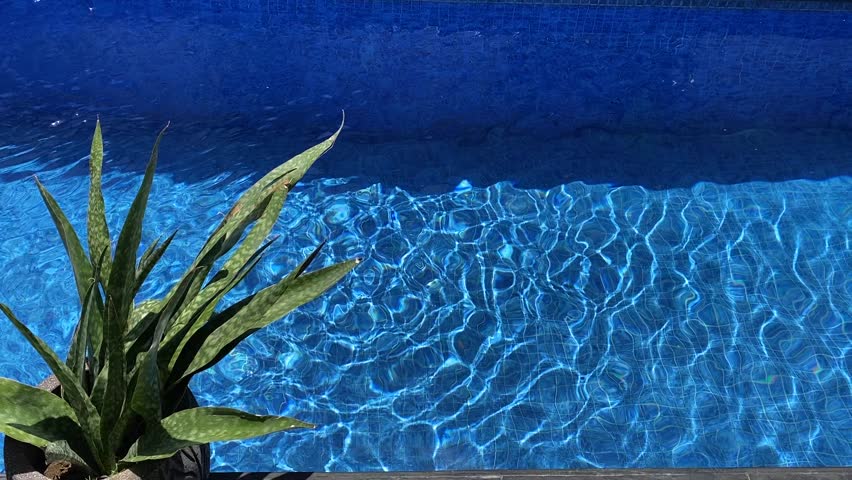Immerse in the beauty of this serene summer pool scene, where sunlight dances on the water's surface, creating mesmerizing ripples