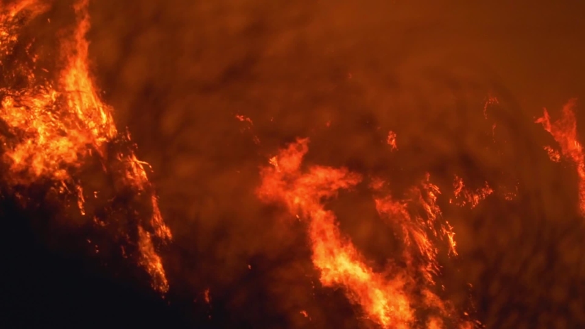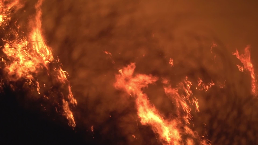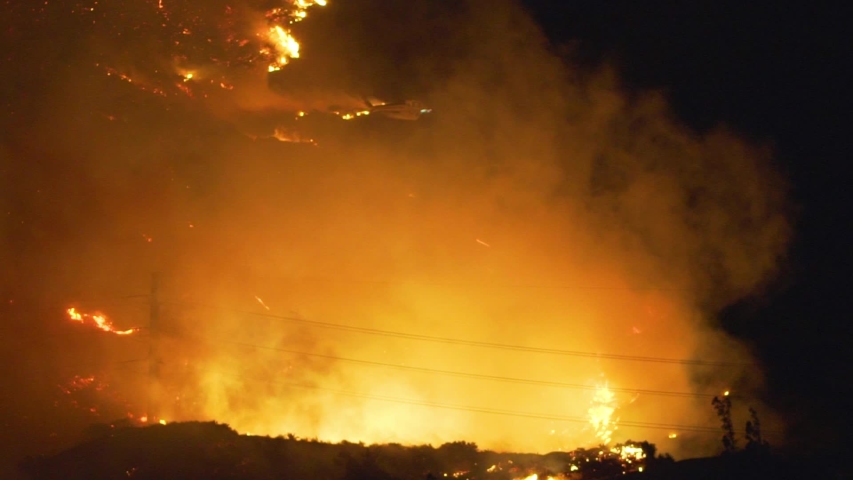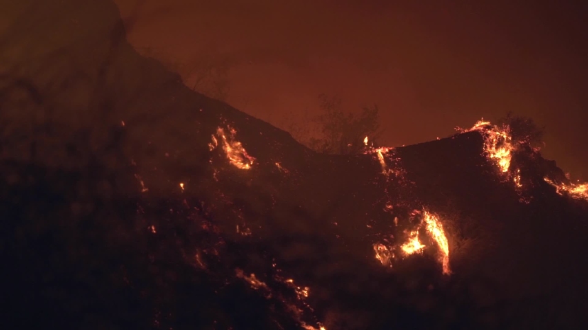 Tracking, slow motion shot of the Californian wildfires, the of burning nature in Northridge, at night time, Los Angeles, California, USA