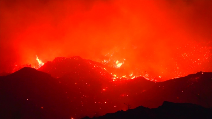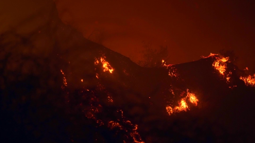 Handheld shot, of burning hills, in the Californian wildfires, at night time, in Northridge, Los Angeles, California, USA