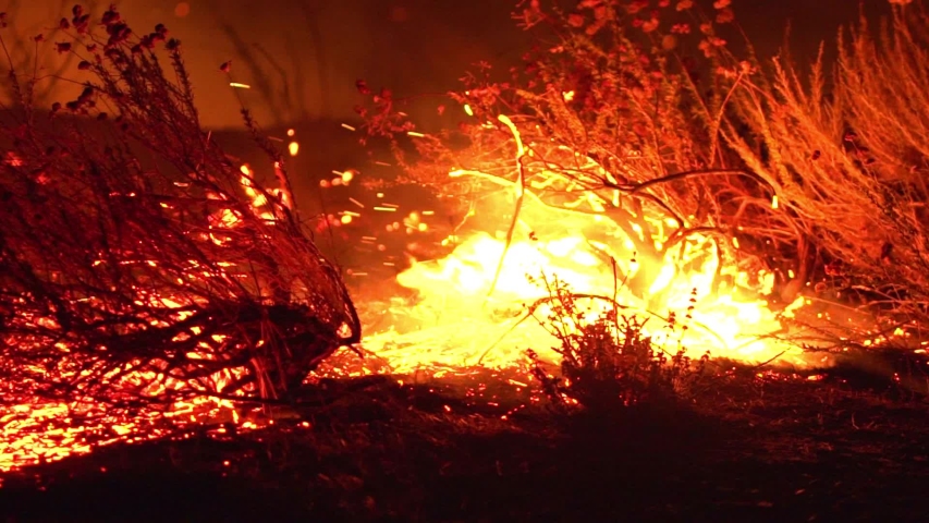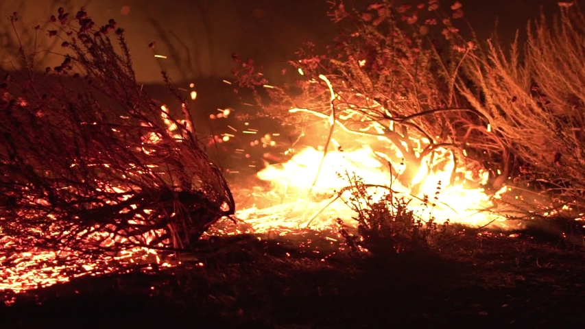 Handheld shot, of burning nature, in the Californian wildfires, at night time, in Northridge, Los Angeles, California, USA