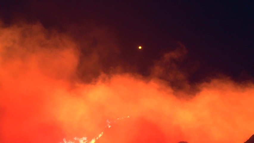 Slow motion, tilt shot, of full moon above burning nature, at the Californian wildfires, night time, in Northridge, Los Angeles, California, USA