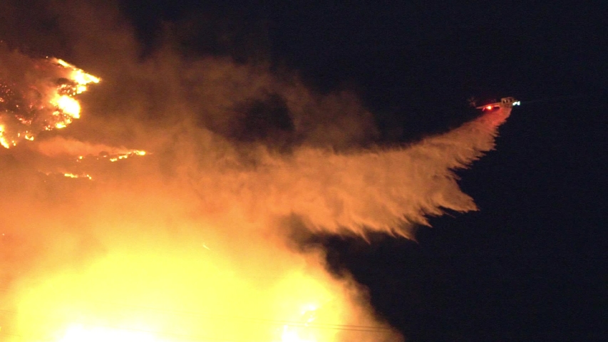 Handheld shot of a firefighter helicopter, trying to stop the Californian wildfires, at night time, in Northridge, Los Angeles, California, USA