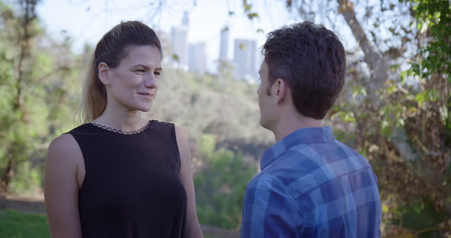 Young woman keeps her male companion in the friend zone while out together on a date in Los Angeles park