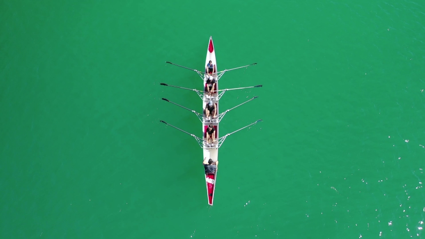 Aerial drone top down view loop video of sport canoe operated by team of young women in emerald clear sea