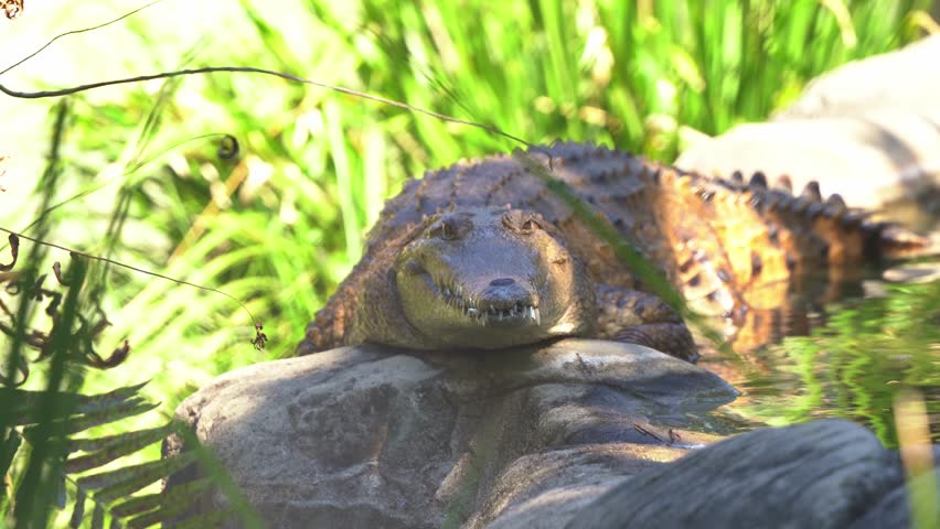 A freshwater crocodile, crocodylus johnstoni basking by the river bank, close up shot