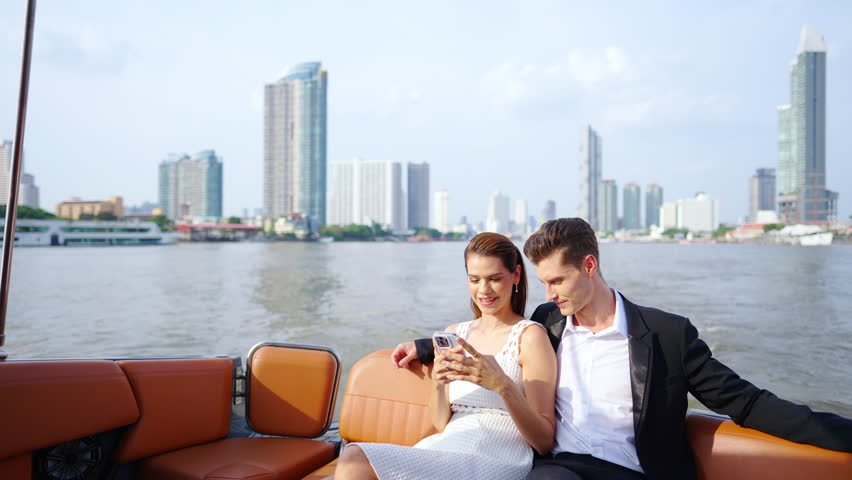 4K Happy Caucasian couple enjoy urban outdoor lifestyle using mobile phone together during travel city on luxury private boat yacht sailing in the river and celebrating holiday event at summer sunset
