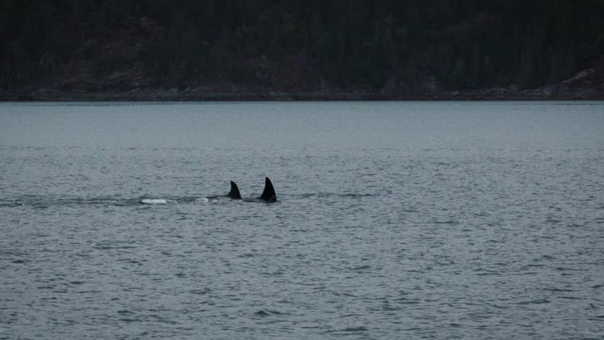 Pod of orcas playing in the discovery islands near Campbell River in desolation sound marine park next to Vancouer Island, British Columbia, Canada