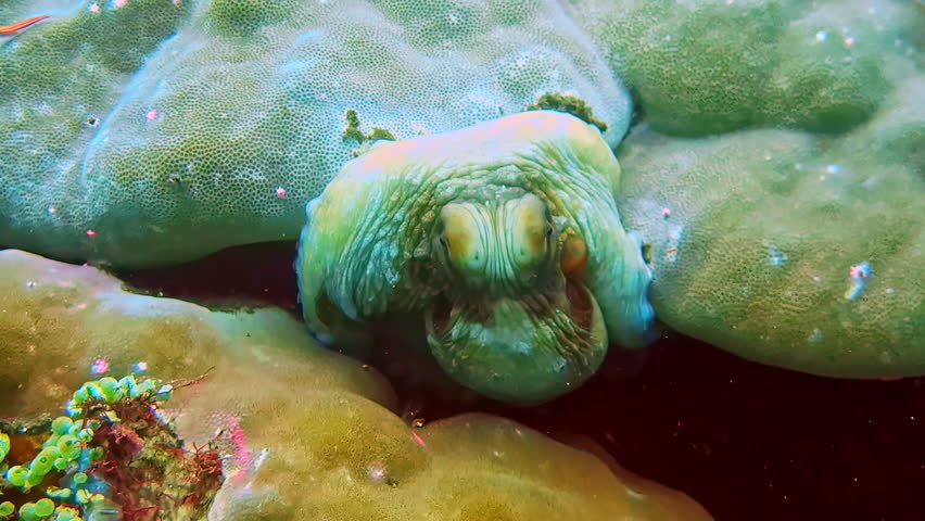 An incredible underwater macro shot from a Bali scuba dive reveals a master of disguise: a Reef Octopus perfectly camouflaged with the color and texture of the coral it is hiding on