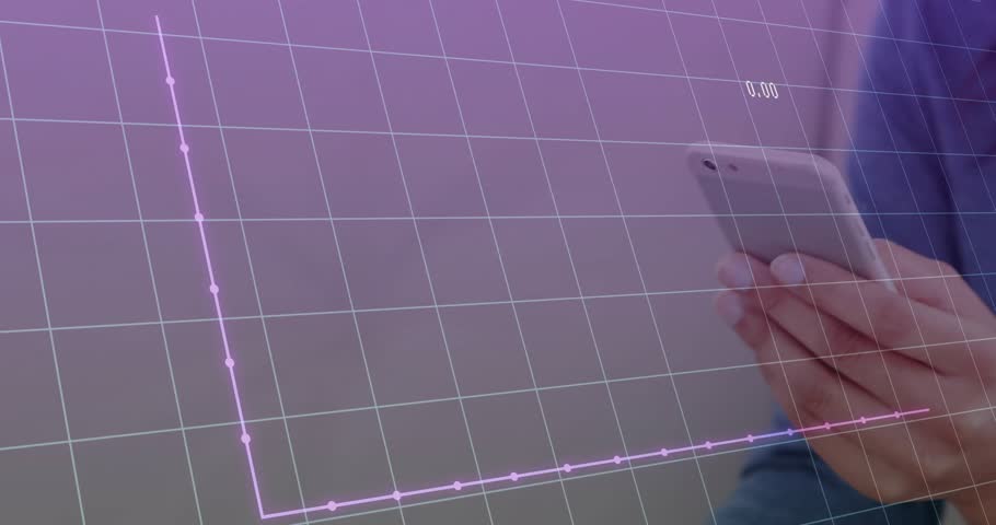 Woman's hands tapping smartphone and generating transparent purple grid bar chart for finance data