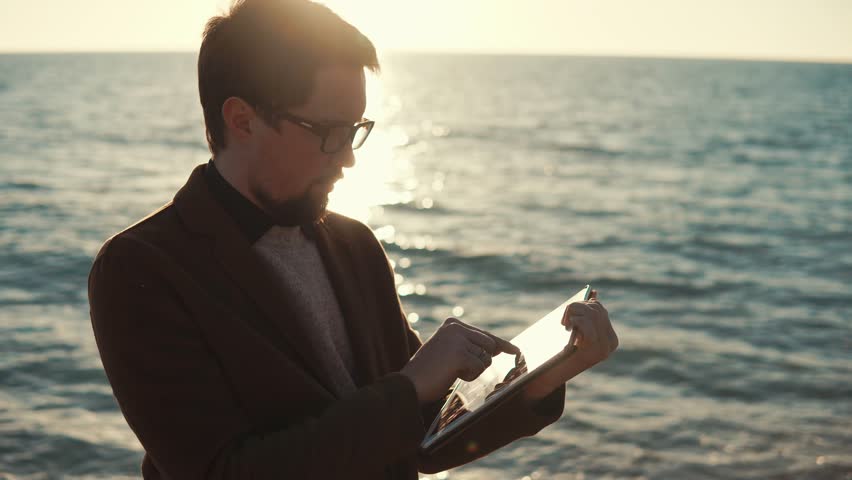 young and cute businessman working near the sea during his autumn vacation, busy man holding a portable tablet with the help of which he goes online