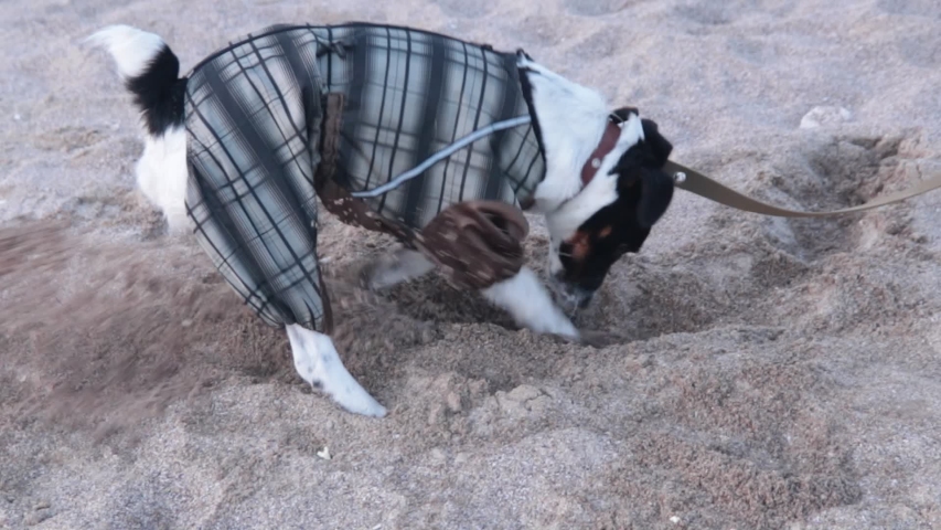 terrier dog in checkered jumpsuit digs a pit in the sand on the beach