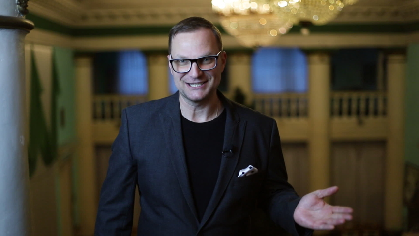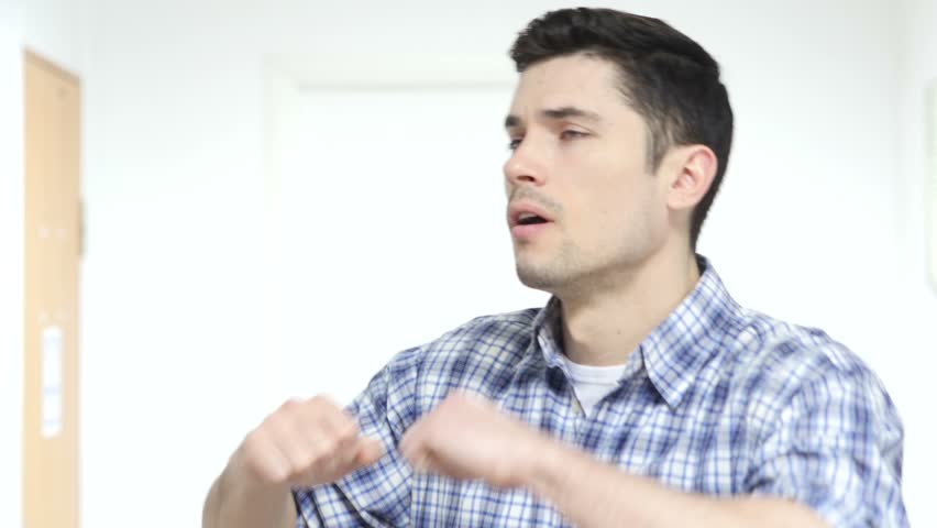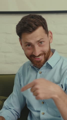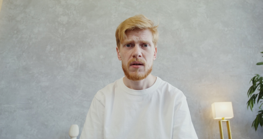 A man of European appearance with a beard, with expressive facial expressions, shouts, proving something, looking at the camera and actively gesturing, sitting in a modern light interior