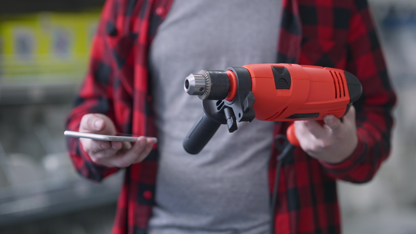 Unrecognizable man holding drill and surfing Internet on smartphone