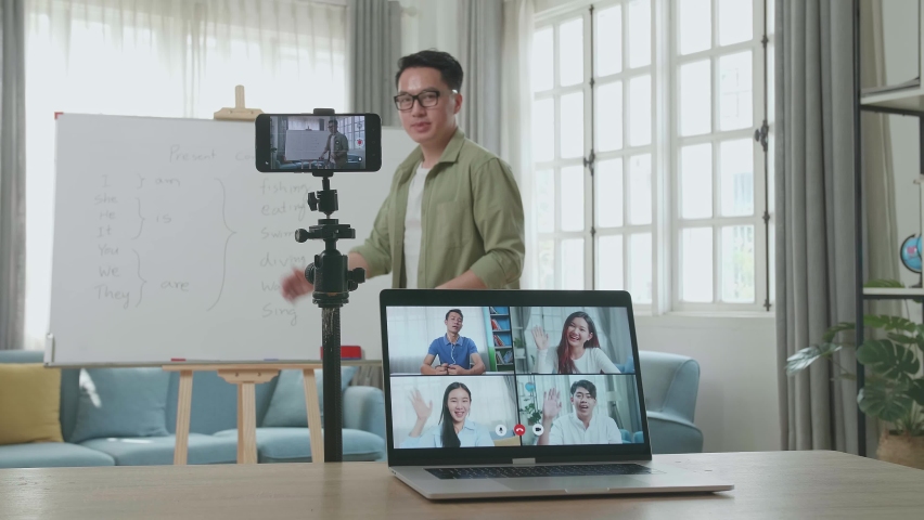 Asian Male Teacher With Glasses Shoots Video By Smartphone Camera And Having Video Call On Laptop While Teaching English At Home