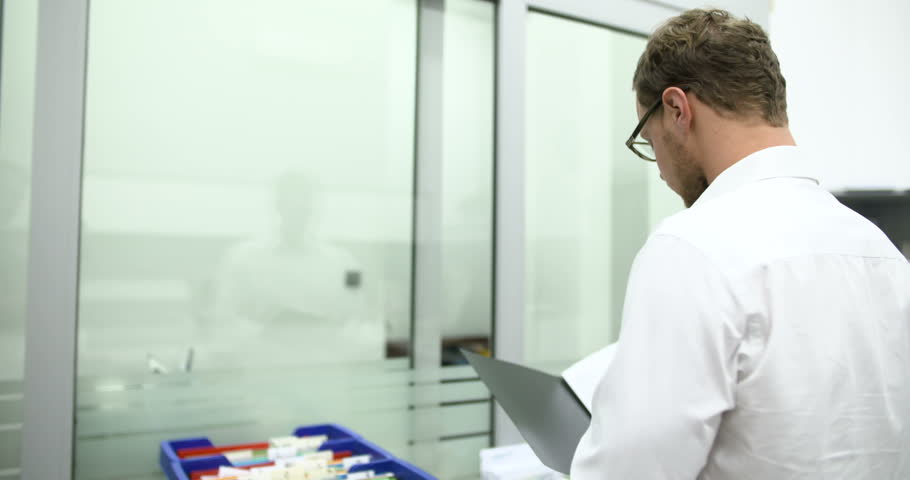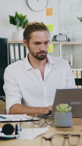 Attractive confident man scientist sitting at workplace in cozy office room and typing on laptop