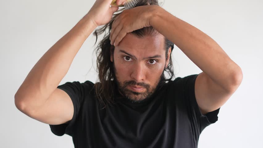 man using brush on his head with baldness, Paddle brush, latino man, hair