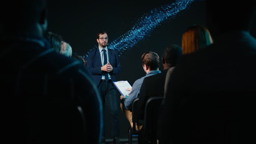 Businessman on stage engaging people in the audience at business conference event, inspirational public speaking