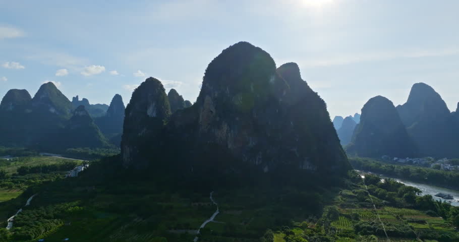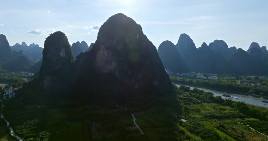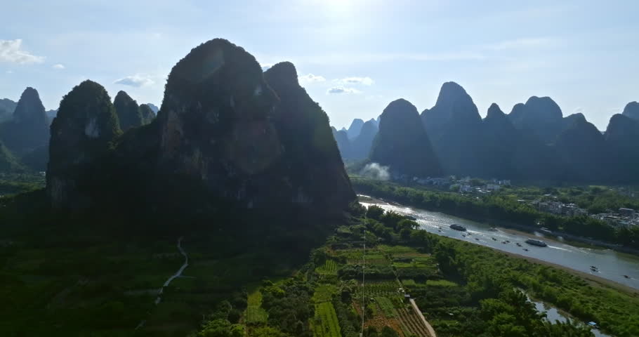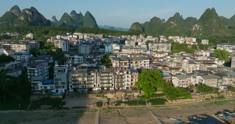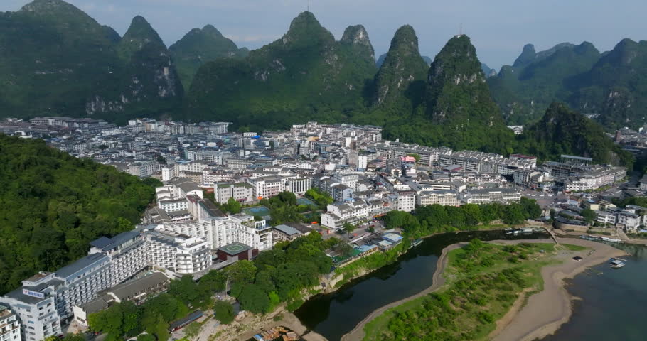Aerial tracking shot in front of the Yangshou town, sunny, summer day in China