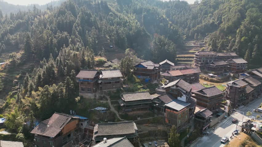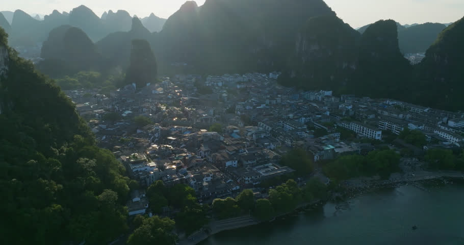 Aerial view descending in front a riverside community in Yangshuo, sunset in China