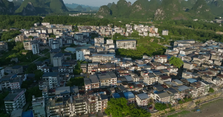 Aerial tracking shot in front suburbs of Yangshuo, summer evening in China