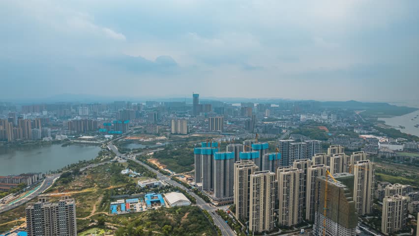 Aerial view of Yueyang city center skyline in Hunan Province, China, showing modern high-rise buildings, residential complexes, and urban development with mountains in background