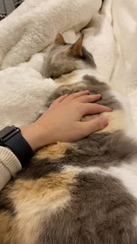 A human hand gently petting a soft, multi-colored cat