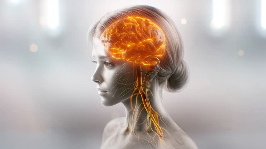 3D Artistic visualization of a woman's glowing brain and nervous system representing mental activity