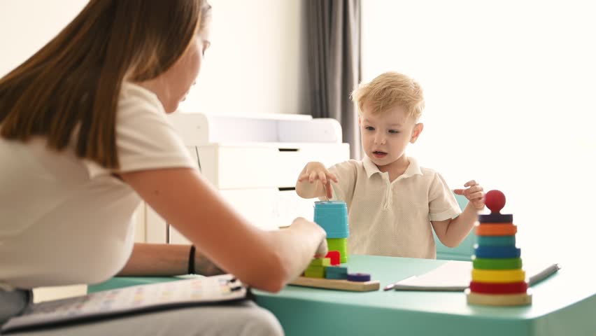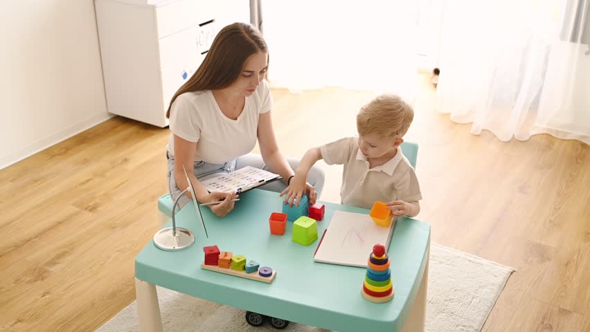 Child engages in creative drawing alphabet with a speech therapist in a bright therapy room focusing on communication skills development